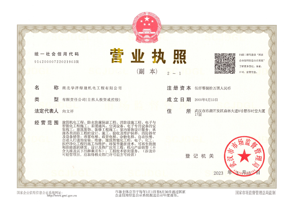 湖北華洋綠建機(jī)電工程有限公司是一家專業(yè)從事機(jī)電工程咨詢、設(shè)計(jì)、施工承包、售后服務(wù)、維修維護(hù)保養(yǎng)的全過程服務(wù)商,是中央空調(diào)系統(tǒng)節(jié)能咨詢、施工承包、運(yùn)營(yíng)能源管理的專業(yè)服務(wù)商,是電梯工程、潔凈室工程的專業(yè)承包商。公司具有建筑機(jī)電安裝工程專業(yè)承包壹級(jí)資質(zhì)、機(jī)電工程施工總承包叁級(jí)資質(zhì)、中華人民共和國(guó)特種設(shè)備生產(chǎn)許可證電梯安裝(含修理)A2級(jí)資質(zhì)、電子與智能化工程專業(yè)承包貳級(jí)資質(zhì)、消防設(shè)施工程專業(yè)承包貳級(jí)資質(zhì)、防水防腐保溫工程專業(yè)承包貳級(jí)資質(zhì)及建筑裝飾裝修工程專業(yè)承包貳級(jí)資質(zhì)。