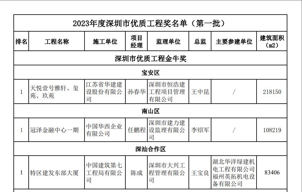 根據(jù)《深圳市建設工程優(yōu)質獎評選辦法》,深圳建筑業(yè)協(xié)會工程質量工作委員會組織專家對申報2023年度深圳市優(yōu)質工程的項目進行了檢查,由委員會審核、復查后向社會公示,并經深圳建筑業(yè)協(xié)會八屆七次常務理事會議審定,共有41個工程項目被評為2023年度深圳市優(yōu)質工程獎,其中金牛獎5項。現(xiàn)將本次獲獎項目中已經完成政府法定相關手續(xù)的29項工程予以公布并表彰。